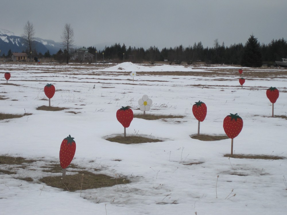 fund raising effort marks milestone ammounts with a strawberry in the ground. hopefully this will be home to a future city center